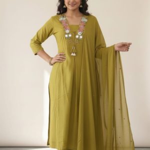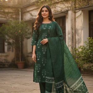 Graceful green kurta set featuring soft floral prints, paired with matching straight pants and a lightweight patterned dupatta—perfect for everyday wear and elegant daytime occasions.