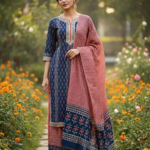 Fresh and graceful, this green printed kurta set is designed to bring effortless elegance to your everyday wardrobe. The kurta features soft floral prints that add a timeless charm, paired with comfortable straight-fit pants for ease of movement. Completing the look is a lightweight dupatta with subtle geometric patterns and border detailing, perfect for a polished ethnic finish. Crafted from breathable fabric, this set is ideal for office wear, casual outings, and daytime festive occasions.